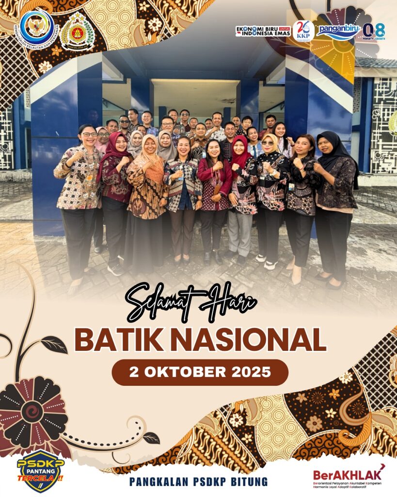 Selamat Hari Batik Nasional 2025 Batik bukan sekadar kain, tetapi simbol identitas, kebanggaan, dan warisan budaya bangsa Indonesia yang telah diakui dunia. Dalam setiap motifnya tersimpan cerita, nilai, serta kearifan lokal yang memperkaya jati diri kita sebagai bangsa. Hari ini, pegawai Pangkalan PSDKP Bitung kompak mengenakan pakaian batik di kantor […]