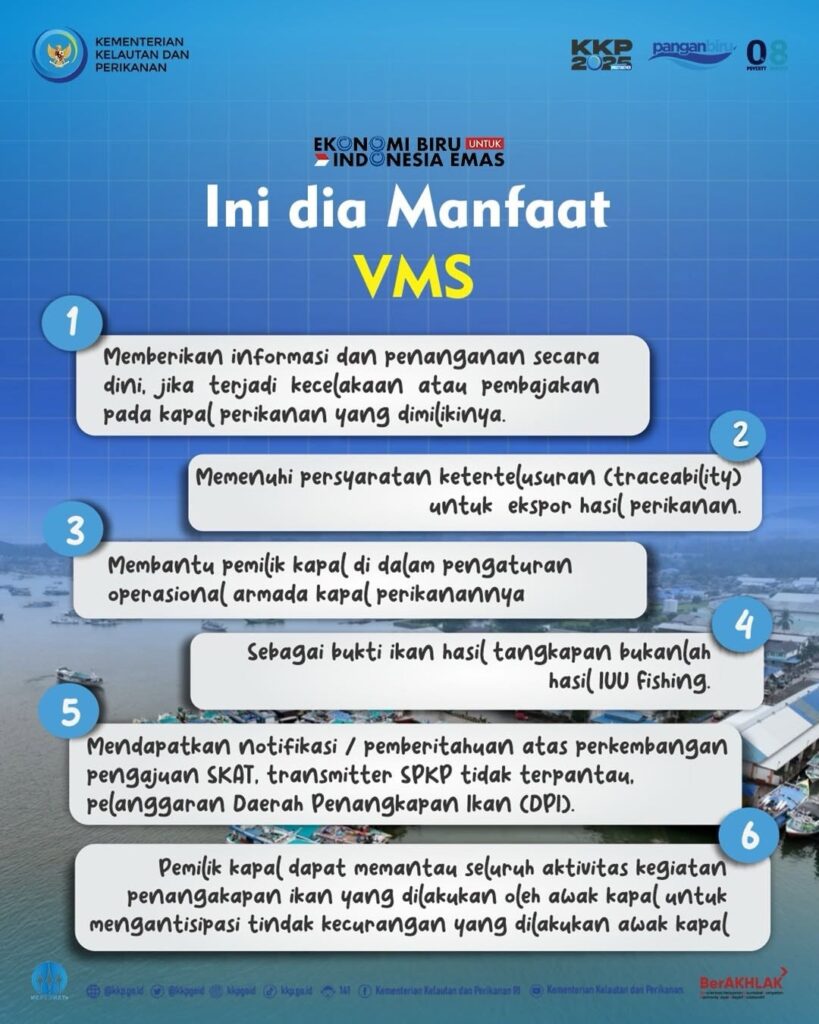Vessel Monitoring System (VMS) atau Sistem Pemantauan Kapal Perikanan adalah alat berbasis satelit yang memantau aktivitas perikanan secara real-time. Kehadiran VMS memberi manfaat nyata bagi nelayan dan pemilik kapal, mulai dari penanganan dini saat terjadi kecelakaan, kemudahan pengaturan operasional armada, hingga pemenuhan ketertelusuran hasil tangkapan untuk kebutuhan ekspor.