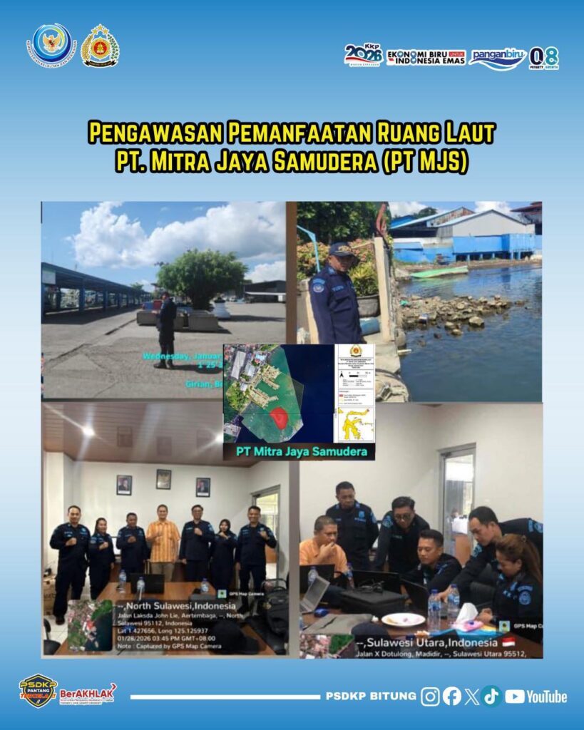 Kegiatan pengawasan dilaksanakan terhadap pemanfaatan ruang laut oleh PT Mitra Jaya Samudera (PT MJS) yang bergerak pada industri perikanan (aktivitas pelabuhan perikanan), berlokasi di Kelurahan Manembo-Nembo, Kecamatan Matuari, Kota Bitung, Provinsi Sulawesi Utara.