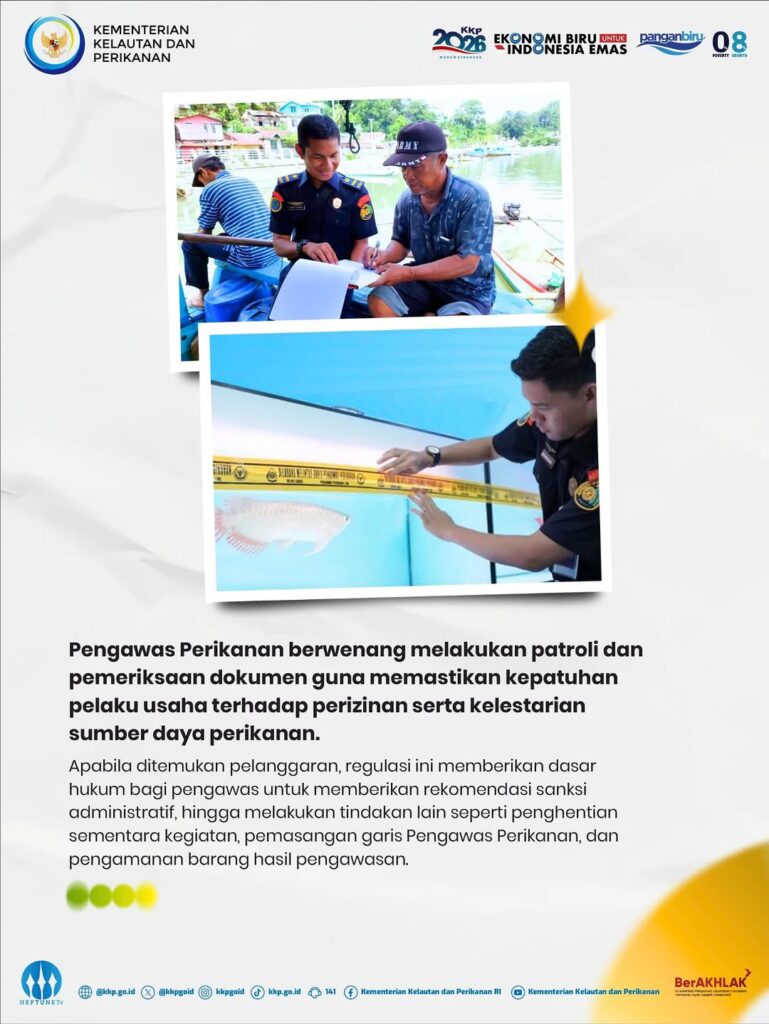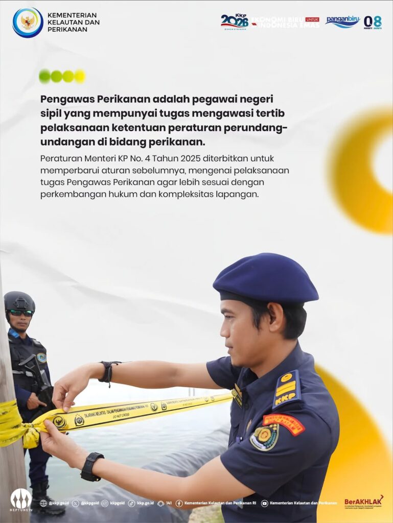 Sahabat Bahari, pelaksanaan tugas Pengawas Perikanan terus diperkuat! Berdasarkan Peraturan Menteri Kelautan dan Perikanan Nomor 4 Tahun 2025, pengawasan dilakukan lebih terukur untuk memastikan sumber daya perikanan kita tetap lestari.
