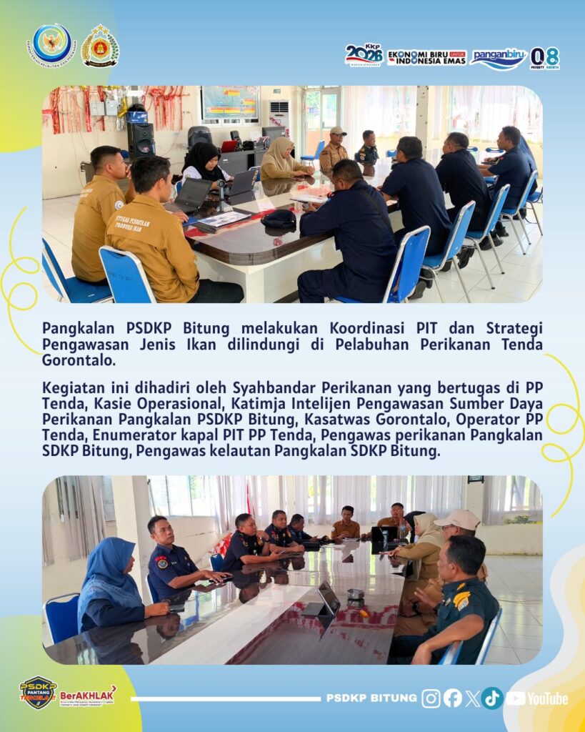 Dalam rangka meningkatkan efektivitas pengawasan perikanan, telah dilaksanakan kegiatan penguatan koordinasi PIT (Penangkapan Ikan Terukur) dan strategi pengawasan jenis ikan dilindungi di Pelabuhan Perikanan Tenda, Gorontalo.