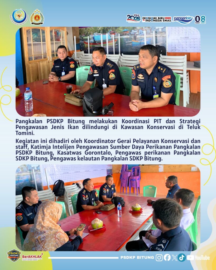 Pangkalan PSDKP Bitung melaksanakan kegiatan Koordinasi PIT dan Strategi Pengawasan Jenis Ikan Dilindungi di kawasan konservasi Teluk Tomini.
